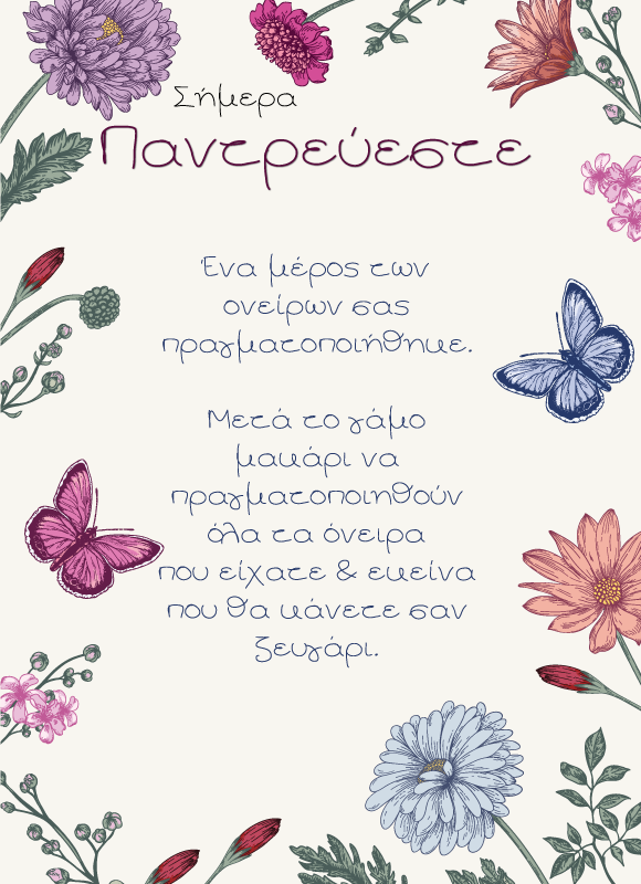 Μπροστινό μήνυμα: Σήμερα Παντρεύεστε. Ένα μέρος των ονείρων σας πραγματοποιήθηκε. Μετά το γάμο μακάρι να πραγματοποιηθούν όλα τα όνειρα που είχατε & εκείνα που θα κάνετε σαν ζευγάρι.