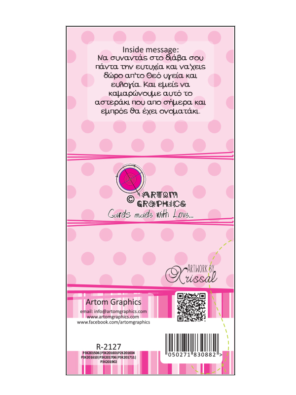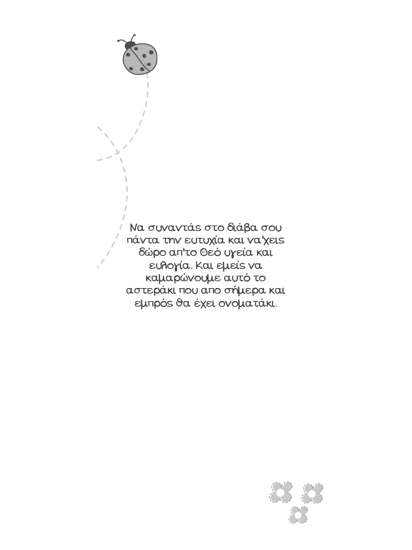 Μήνυμα μέσα στην κάρτα: Να συναντάς στο διάβα σου πάντα την ευτυχία και να’χεις δώρο απ’το Θεό υγεία και ευλογία. Και εμείς να καμαρώνουμε αυτό το αστεράκι που από σήμερα και εμπρός θα έχει ονοματάκι.